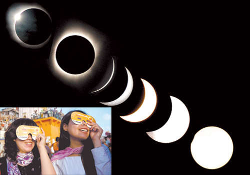 هذه الصورة المركبة التي التقطت في 22-7-2009م توضح المراحل المختلفة لكسوف الشمس في قرية بيهاتا على بعد30 كيلو مترا من مدينة جواهاتي، |