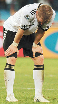 اعترف لاعب الوسط الألماني باستيان شفاينشتايجر بأن ألمانيا لم تقدّم أمام إسبانيا نفس الأداء الذي قدمته في المباراتين السابقتين أمام إنجلترا والأرجنتين في مونديال جنوب إفريقيا، لكنه أقرَّ بتفوق إسبانيا التي وصفها بأنها «أفضل فريق في العالم». وذكر لاعب وسط بايرن ميونيخ بعد خسارة منتخب «الماكينات» أمام إسبانيا في مباراة الدور قبل النهائي للمونديال التي أقيمت بمدينة ديربان: «لم نلعب خططياً بنفس التفوّق الذي قدّمناه أمام إنجلترا والأرجنتين، لكن حتى مع ذلك كانت أمامنا فرصة عندما كانت النتيجة التعادل السلبي». وأضاف بحزن: «لكن أمام أحد فرق القمة كإسبانيا، لا يكون الأمر بهذه السهولة». وقال عن هدف المباراة الوحيد الذي أحرزه المدافع كارلس بويول في الدقيقة 73 من ضربة رأس بعد كرة ركنية «تلقت شباكنا هدفاً من لعبة ثابتة، وهو ما لم يحدث معنا منذ فترة طويلة». وقال: «إسبانيا هي الفريق الأفضل في العالم وهو ما ظهر بوضوح»، مضيفاً أن «ألمانيا يمكنها الفخر بنا، لكن علينا مواصلة العمل، لدينا مستقبل كبير، لكن اليوم رأينا ما يعنيه فريق قمة». وقال عن طريقة اللعب التي فرضتها إسبانيا: «يحنقني الخروج بعد أن اقتربنا بهذا القدر من المباراة النهائية، وأننا لم نلعب كما كنا نريد. لقد عدونا كثيراً بالكرة في الخلف» في إشارة إلى سيطرة إسبانيا على اللعب.