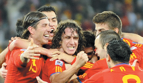 أبدت وسائل الإعلام الإسبانية أمس الخميس سعادتها البالغة بمنتخب بلادها الأول لكرة القدم بقيادة المدرب فيسنتي ديل بوسكي بعدما تأهل الفريق إلى أول نهائي كأس عالم في تاريخ البلاد بتغلبه مساء أمس الأربعاء 1- صفر على ألمانيا بالدور قبل النهائي من بطولة كأس العالم 2010 بجنوب إفريقيا. واحتل الفوز الإسباني المذهل الصفحات الرئيسة لجميع الصحف الإسبانية الصادرة أمس فيما أعربت العناوين الرئيسة عن إعجابها الشديد بالطريقة التي سيطرت بها إسبانيا على مباراة الدور قبل النهائي في ديربان منذ بدايتها وحتى النهاية. وجاء العنوان الرئيس لصحيفة «ماركا» المدريدية أمس: «الأفضل في العالم» وتلاها عنوان آخر يقول: «ملايين الإسبان يحتفلون بالفوز في الشوارع». ونشرت «ماركا» العديد من الصور لاحتفالات الجماهير الإسبانية التي ملأت شوارع البلاد. وكتبت صحيفة «سبورت» الكاتالونية في عنوانها الرئيس: «بويول يسجل هدفاً.. وإلى النهائي?». وكان قائد نادي برشلونة كارلس بويول قد سجل الهدف الوحيد في ديربان أمس الأول للمنتخب الإسباني المتطبع بطابع برشلونة إلى حد كبير، حيث ضمت القائمة الأساسية لتشكيل منتخب الماتادور أمس سبعة لاعبين من برشلونة، مما دفع العديد من الجماهير الكاتالونية للتكاتف مع منتخب إسبانيا للمرة الأولى. وشهدت منطقة رامبلاس الشهيرة ببرشلونة احتفالات صاخبة بفوز إسبانيا رغم أن هذه المنطقة لم تستقبل أو ترفع علماً إسبانيا واحداً حتى هذا الأسبوع.
