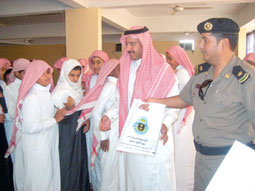 ألقى الرائد مشعل حضيض العويضي مدير شعبة العلاقات والتوجيه بإدارة دوريات الأمن بمنطقة تبوك محاضرة على طلاب متوسطة أبي بكر الصديق عن برنامج سلامتي في مرحلته الأولى حيث تحدث الرائد مشعل عن أهداف البرنامج وتعريفه بمخاطر السرعة وقطع الإشارة وأهمية ربط حزام الأمان والتنبيه على عدم ترك المركبة في وضع التشغيل، وطالب الأبناء بنقل مثل ذلك لآبائهم وقدم لهم نصائح عن أخطار التفحيط والتجمهر أمام المفحطين، حيث عرض لهم لقطات توضح النهاية المأسوية لذلك، وفي نهاية المحاضرة قدم الرائد مشعل ومدير المدرسة خالد أحمد المطيري الهدايا المقدمة من الإدارة العامة للدوريات الأمنية لكافة طلاب المدرسة.