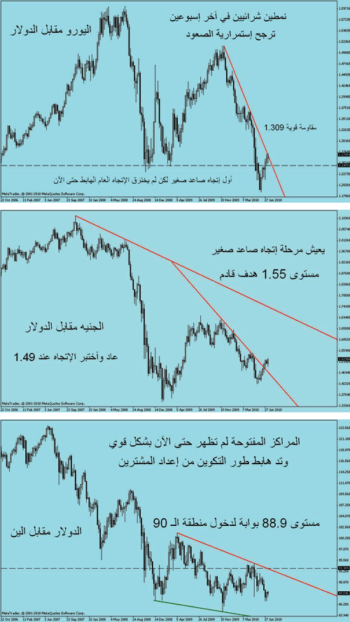 الصناعة في اليابان دعمت الين أمام الدولار خصوصا، ويظهر أنها لا تعاني ضغط عامل التكاليف الإنتاجية أمام منطقة اليورو. تصرف مفرح قامت به الحكومة اليونانية بشأن سنداتها رفع من شهية التداول بعد هجرتها، لكن معظم صناع السوق هناك مهتمون أكثر بنتائج فحص البنوك والنتائج المالية للموسم الثاني. وفي بريطانيا يظهر أن لندن هي الأوفر حظاً في الأسبوع حيث يحتفل مستثمروها بأمنية تحققت، وهي أكبر ما يطمح إليه المتفائلون هناك. أما أمريكا فكانت أرقامها شحيحة، لكن المضاربين في أسواق الأسهم كانوا الأنشط في أسواقها مقارنة بالأسواق الأخرى في العالم. ولمزيد من التفصيل دعونا نأخذ جولة اقتصادية نروي خلالها أحداث هذا الأسبوع؛ لنعرف ماذا يدور خلف أهم العملات الأجنبية في العالم: