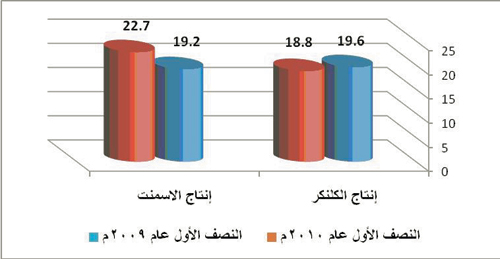 حجم إنتاج الكلنكر: (المادة الأولية لصناعة الإسمنت) وأورد التقارير مقارنة عن الإنتاج، حيث بلغ حجم الإنتاج الفعلي لشركات الإسمنت المحلية من الكلنكر خلال النصف الأول لعام 2010م (18.8) مليون طن بانخفاض عن حجم الإنتاج خلال الفترة المماثلة من عام 2009م بنسبة (4 في المئة)، حيث كان حجم الإنتاج خلال النصف الأول لعام 2009م (19.6) مليون طن، وقد حققت شركة إسمنت السعودية أعلى إنتاج بين شركات الإسمنت المحلية، حيث بلغ حجم إنتاجها من الكلنكر (2.8) مليون طن وبنسبة (14.7 في المئة) وبانخفاض عن حجم إنتاجها خلال الفترة المماثلة لعام 2009م بنسبة (32.8 في المئة).