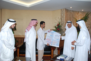 وأكد على أن الجامعة ممثلة في عمادة شؤون الطلاب تدعم طلابها المتميزين والمتفوقين وغيرهم بدعم معنوي ومادي لكي يسهل لهم ويساعدهم على الاستمرار بالتفوق والتميز في شتى المجالات، كما أشار مدير الجامعة إلى أن الجامعة تسعى للوصول إلى أعلى مستويات التفوق العلمي والثقافي والإبداعي وتنمية المواهب والإبداع لدى طلبة الجامعة. وتقديراً من عمادة شؤون الطلاب لتفوق الطالب ياسر الحربي فقد تم تسليمه درعاً بهذه المناسبة ومبلغاً مادياً من عميد شؤون الطلاب بالجامعة. هذا وكان الطالب ياسر الحربي قد اخترع جهاز للتنبيه بأوقات الدواء والتثقيف الدوائي في المنزل لمساعدة شريحة كبيرة من أفراد المجتمع كما قدم الطالب ياسر الحربي شكره لمعالي مدير الجامعة د.خالد الحمودي ود.خالد الشريدة عميد شؤون الطلاب وعميد كليه الصيدلة د. محمد العريني على الدعم المعنوي والمادي الذي ناله منهم وكان سبب في استمراره وتطوير موهبته وحصوله على مراكز متقدمة.