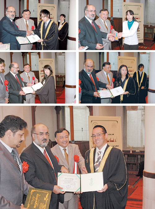 احتفل المعهد العربي الإسلامي في طوكيو بتخريج الدفعتين الخامسة عشرة والسادسة عشرة من طلاب وطالبات المعهد، حيث بدأ الحفل بالقرآن الكريم تلاه أحد الطلاب اليابانيين بالمعهد ثم رحب سعادة مدير المعهد بمعالي المدير وسعادة السفير والحضور الكرام واستعرض جهود المعهد وإنجازاته والخطط التي يعتزم المعهد تنفيذها خدمة للغة العربية، وللمجتمع الياباني الصديق، ثم تحدث سعادة سفير خادم الحرمين الشريفين الدكتور عبد العزيز تركستاني عن سيرة المعهد وإنجازاته خلال أكثر من ربع قرن، والشراكة الاستراتيجية بين الشعبين الصديقين، ثم ارتجل معالي مدير جامعة الإمام محمد بن سعود الإسلامية الأستاذ الدكتور سليمان بن عبد الله أبا الخيل كلمة ضافية عبّر فيها عن شكره لحكومة خادم الحرمين الشريفين وولي عهده الأمين وسمو النائب الثاني على ما تلقاه الجامعة من دعم ومؤازرة، وثمن معاليه لمعالي وزير التعليم العالي رعايته الحفل ودعمه المستمر للجامعة ومؤسساتها داخل المملكة وخارجها، كما عبّر عن شكره لسفير خادم الحرمين الشريفين على دعمه للمعهد ومؤازرته لمنسوبيه، ثم هنأ الطلاب والطالبات بتخرجهم ودعاهم إلى بذل المزيد من الجهد في تعلم اللغة العربية وممارستها وحثهم على أن يكونوا رُسل خير ومحبة وسلام للغة العربية التي هي لغة الإسلام والسلام، ثم توالت بعد ذلك فقرات الحفل، وقدمت كلمة الطلاب وكلمة الخريجين إحدى خريجات المعهد ، بعد ذلك سلّم معالي مدير الجامعة شهادات الخريجين والميداليات والجوائز للمتسابقين ثم سلمت دروع الجامعة التذكارية لكل من سعادة سفير خادم الحرمين الشريفين الدكتور عبد العزيز تركستاني وسعادة الملحق الثقافي الدكتور عصام بخاري وسعادة مدير المعهد الدكتور خالد الشويرخ والدكتور أحمد النشوان ثم شرف معاليه حفل الغداء الذي أقيم بهذه المناسبة.