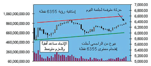 المؤشر العام يحاول إكمال نمط شرائي عاكس للاتجاه الهابط من 6939 نقطة هذا النمط ذو مصداقية منخفضة والسبب يعود إلى مكان تواجده أما من حيث التوقيت فهو جيد ويتزامن مع رغبة معظم صناع أسواق الأسهم العالمية في التعامل مع السوق (مضاربة بحتة) لاسيما وأن معظم المؤشرات الاقتصادية العالمية تشير إلى أن العالم في مرحلة (ركود)، هذا النمط من المرجح أن يقود السوق إلى مستويات (6424 - 6600 - 6767 - 6939 نقطة) في حال بقي الجو العام للأسواق على ما هو عليه أي لم تحلق أية أخبار سلبية فوق سماء الأسواق، وبالنسبة لجلسة الأمس واضح جداً أن المؤشر العام حاول بقيادة كل من معادن والراجحي اختراق مستوى 6318 نقطة لكنه لم يستطع بل اكتفى بتجاوز 6285 نقطة وهذا جيد، والسبب يعود إلى بيوع ظهرت في الراجحي بعد دخوله منطقة 80 ريالا وغالباً الحواجز النفسية تحتاج لوقت حتى يتم عتقها من البائعين، أما سابك لا زالت محيدة تحييداً تاماً والأهم من ذلك تم توفير بعض السيولة لشد عزوم معادن إلى 19.4 ريالا وتخطي 18.5 ريالا لتعود إلى اتجاهها الصاعد (السابق) والغريب أنه عندما تخلى الذهب عن اتجاهه الصاعد في السوق بدأت الحركة تدب من جديد في معادن مما يدل على أن السوق محاط بجو مليء بإستراتيجيات وتكتيكات مضاربية بحتة، وبإغلاق السوق عند 6316 نقطة يستمر التحرك ضمن قناة صاعدة أفقيا أما العزوم ممثلة بالكميات المتداولة بلغت 134 مليون سهم تصنف بأنها متوسطة ونذكر بأن أحجام التداول في آخر 3 جلسات تظهر نمواً في النسق وتطابقاً مع النقاط التي يكسبها السوق يوماً بعد يوم وهذا جيد جداً.