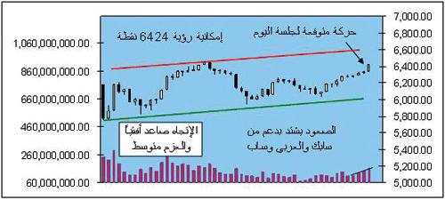 المضاربون لديهم الاستعداد لشد عزوم السوق لكنهم عاكفون على جس نبض المستثمرين بعد اكتمال نتائج الموسم الثاني المالية، فهم يريدون منهم تقييما عادلا للسوق (بيع أو شراء ما يمكن) وفق تقييماتهم بعد ذلك يتم الصعود بشكل حاد وتبدأ الفوضى المضاربية في السوق، ومهم جداً مراقبة مستوى 80،5 ريال لمصرف الراجحي ويتوقع تجاوزها إلى 84 ريالا وإتمام اتجاه صاعد ذي نفس قصير للسهم وللمؤشر العام وذلك قبيل رمضان، وبعد دمج حركة التداول لآخر 51 جلسة يرجح أن يغلق السوق عند 6424 نقطة في جلسة مليئة بالاخضرار.