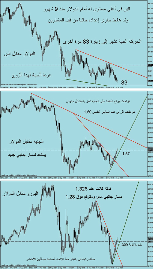 - عملة الاحتياط الأكثر جدلاً (العملة الخضراء): القمم (89 و88) التي تم تسجيلهما منذ مطلع 2009م وحتى الآن تظهر أن المشترين كانت عزومهم ضعيفة وعبث البنوك المركزية لا يزال مستمر مما أرهق السوق بهذه التقلبات والاتجاه حاليا هابط وهناك رغبة في الرجوع لمنطقة السبعينات أمام سلة عملاته.