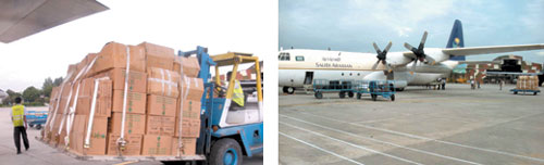 وقام السفير عبدالعزيز الغدير بتسليم شحنة الطائرة التي تضمنت مواد إغاثية متنوعة إلى نائب مدير إدارة الكوارث الطبيعية الوطنية الباكستانية حسن ذو الفقار؛ ليتم نقلها إلى المناطق الشمالية الغربية من باكستان لتوزيعها على المتضررين هناك.