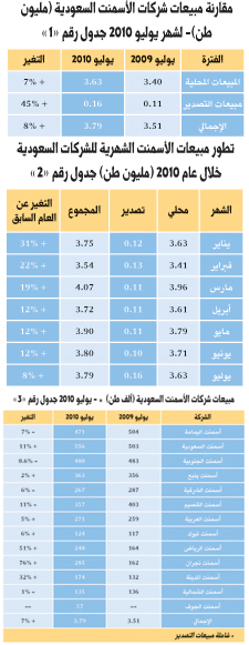 سجلت مبيعات شركات الأسمنت السعودية ارتفاعاً في المبيعات الإجمالية خلال شهر يوليو 2010، وبنسبة 8% مقارنة بالمبيعات المسجلة في نفس الفترة من عام 2009، حيث بلغت المبيعات خلال شهر يوليو الماضي 3.79 مليون طن، مقارنة بـ 3.51 مليون طن في يوليو من عام 2009 حسب موقع أرقام.
