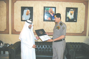 كرَّم المقدّم خالد الجميعة قائد الدوريات بمنطقة الرياض الرقيب أول محمد بن مسلي الدعجاني وقدَّم له شهادة تقدير ودرعاً تذكارياً للجهود التي بذلها في خدمة الأمن خلال فترة عمله السابقة، تم ذلك وسط احتفاء زملائه الذين عبَّروا عن تمنياتهم لزميلهم بالتوفيق في حياته المستقبلية بعد التقاعد. |