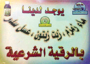 في البداية كانت العلاجات الشعبية والقراءات وغيرها تتم في الخفاء. الآن.. لأنهم أمنوا العقوبة أصبحت لوحاتهم الدعائية تتوسط الشوارع الرئيسية والأماكن الإستراتيجية،، وأصبحت هذه العلاجات مهنة من لا مهنة له،، الكل يقرأ، ويصف أدويه شعبيه ويتاجر بالرقية الشرعية،، ويتنافسون على ذلك ويمصون جيوب الموهومين بالمرض حتى أصحاب مراكز التسوق والبقالات الصغيره حينما اشتدت غيرتهم من مكاسب الرقاة أصبحوا يبيعون ماء زمزم وزيت الزيتون والعسل والسدر بالرقية الشرعية داخل محلاتهم وأصبحت سلعه في متناول أيدي الجميع.. هذه اللوحة الدعائية داخل إحدى البقالات.. أين أعين الرقابة.. ومن سمح لهم يبيعون الوهم على الناس.