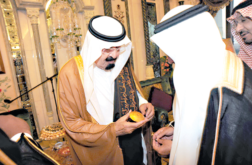 تسلم خادم الحرمين الشريفين الملك عبدالله بن عبدالعزيز أمس من وزير التعليم العالي الدكتور خالد بن محمد العنقري ومدير جامعة أم القرى الدكتور بكري معتوق عساس شهادة الدكتوراه الفخرية في خدمة الإنسانية.