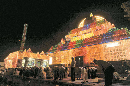 عدد من المسلمين الهنود يؤدون صلاة التراويح في أحد المساجد الذي زيّن بالأنوار الملونة استعدادًا لاستقبال عيد الفطر