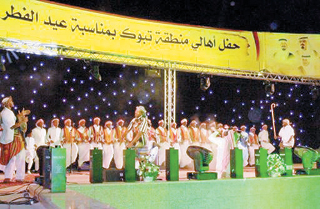 أقامت أمانة منطقة تبوك احتفال أهالي المنطقة مساء أمس الأول بعيد الفطر المبارك وذلك بمركز الأمير سلطان الحضاري. وفي بداية الحفل ألقيت قصيدة شعرية ثم قدم لون الدحه وهو أحد الألوان التي تتميز بها منطقة تبوك ثم رقصة السيف قدمتها فرقة من جيزان بعدها لون السامري. إثر ذلك قدمت لوحة تراثية اشتركت فيها جميع الفرق المشاركة في حفل الأهالي. حضر الحفل عدد من مديري الدوائر الحكومية وجمع من الحضور.
