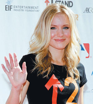 تحيي الممثلة الأمريكية كرستينا بيل وسائل الإعلام وهي تشارك في حملة لمواجهة مرض السرطان عبر برنامج تلفزيوني استهدف جمع تبرعات لدعم أبحاث لهذا الخصوص في مدينة كولفير بولاية كاليفورنيا.