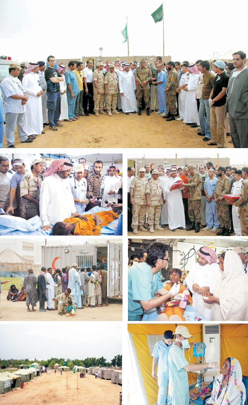 دشن سفير خادم الحرمين الشريفين لدى جمهورية باكستان الإسلامية عبدالعزيز بن إبراهيم الغدير أمس الأول السبت مخيم خادم الحرمين الشريفين لإيواء المتضررين من الفيضانات في مدينة تتا الواقعة في إقليم السند الجنوبي. حضر تدشين المخيم الذي أقيم بجوار المستشفى الميداني السعودي قائد المنطقة العسكرية في تتا العميد كليم آصف وعدد من الضباط وقادة فرق الإغاثة في الجيش الباكستاني ومن الجانب السعودي المشرف العام على المستشفيين الميدانيين السعوديين في باكستان العميد طبيب سعود بن فالح العماني ومساعد الملحق العسكري السعودي في باكستان العقيد طيار ركن سعيد مشافي عفتان ونائب القنصل العام في كراتشي ورئيس الإغاثة العاجلة في المكتب الإقليمي لحملة خادم الحرمين الشريفين في باكستان بندر العجمي. وأوضح السفير الغدير أن المخيم يأوي 500 عائلة ويقدم من خلاله المواد الإغاثية بصفة مستمرة حتى انتهاء فترة الإغاثة العاجلة. وقال إن المخيم يعد امتداداً للجسر البري الذي انطلق الأسبوع الماضي تحت عنوان ألف شاحنة لمليوني متضرر والذي يتم تسيير قوافله أسبوعياً من مدينة إسلام آباد إلى المناطق المتضررة في مختلف أنحاء باكستان. وعقب التدشين تجول السفير الغدير في المخيم وتفقد أحوال المتضررين وأعمال الإغاثة التي تقدم لهم.. كما قام بتوزيع السلال الغذائية عليهم وقدم الحلوى لأطفال المخيم بمناسبة عيد الفطر المبارك. وكان السفير الغدير قد قام بزيارة للمستشفى الميداني السعودي في مدينة تتا التقى خلالها بالكوادر الطبية السعودية ونقل إليهم تهاني خادم الحرمين الشريفين وسمو ولي عهده وسمو النائب الثاني وكافة أفراد الشعب السعودي بمناسبة حلول عيد الفطر المبارك. وتفقد سير عمل المستشفى والخدمات التي يقدمها والتقى بالمرضى المنومين الذين عبروا عن خالص شكرهم لخادم الحرمين الشريفين الملك عبدالله بن عبدالعزيز آل سعود ودعوا الله سبحانه وتعالى أن يجعل ذلك في ميزان حسناته.
