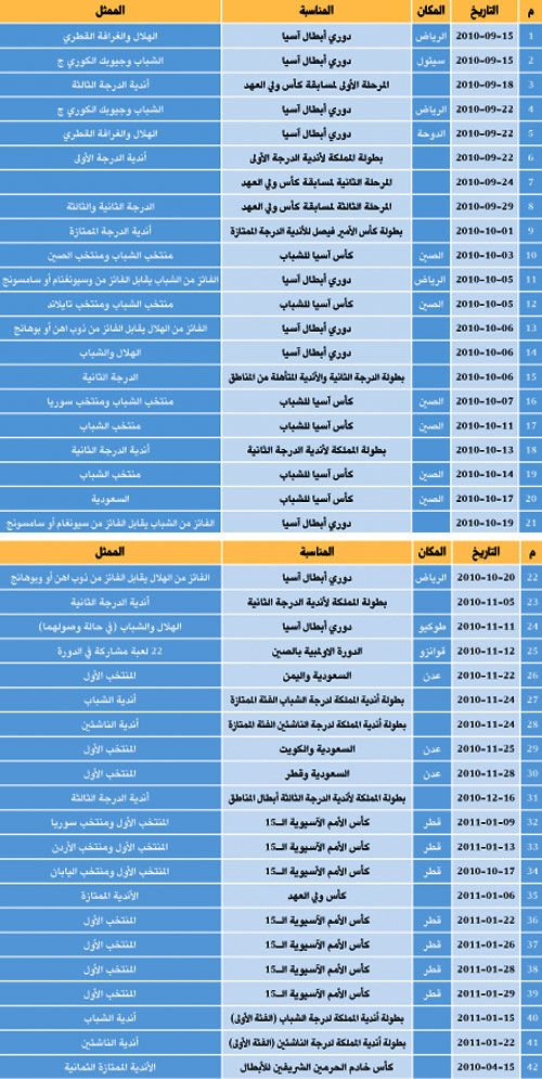 وكان منتخبنا لذوي الاحتياجات الخاصة قد أهدى الوطن بطولة العالم لذوي الاحتياجات الخاصة ومحافظته على اللقب، وتشهد (الرزنامة) مشاركة المنتخبات السعودية لكرة القدم في العديد من البطولات حيث يشارك المنتخب الأولى في كأس الأمم الآسيوية التي ستقام في دولة قطر ومشاركته أيضا في كأس دورة الخليج التي ستقام في العاصمة اليمنية عدن ومشاركة منتخب الشباب في كأس آسيا للشباب في الصين ومشاركة المنتخبات الرياضة في دورة الألعاب الآسيوية في قوانزو بالصين إضافة البطولات المحلية التي بدأت وتتواصل بانطلاق بطولة المملكة لأندية الدرجة الأولى وانطلاق المرحلة الثانية من مسابقة كأس ولي العهد وبطولة الأمير فيصل بن فهد لأندية الممتازة وبطولات المملكة لدرجتي الناشئين والشباب للأندية الممتازة وأندية الدرجة الأولى وتختتم بكأس خادم الحرمين الشريفين للأبطال، وكانت بطولة دوري زين للمحترفين ودوري الأندية الممتازة وبطولة كأس الاتحاد للشباب وبطولة كأس الاتحاد للناشئين قد انطلقت الشهر الماضي، والتي ستكون كالتالي: