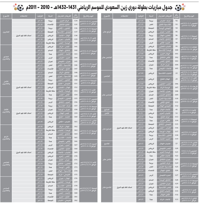 تضمن الجدول تحديد مواعيد المباريات المؤجلة من الدور الأول التي من أبرزها مباراة الاتحاد والهلال في جدة (الأسبوع السابع) التي تقرر أن تجرى يوم الأحد 2-3-1432هـ. وكذلك مباراة الشباب والهلال (الأسبوع التاسع) التي تقرر أن تجرى يوم الاثنين 18-3-1432هـ وستنطلق مباريات الدور الثاني يوم الخميس 3 / 1 / 1432هـ بمباريات الجولة الرابعة عشرة. ثم يتوقف الدوري لمدة خمسين يوماً بعد الجولة السادسة عشرة لمشاركة المنتخب في بطولة كأس آسيا في قطر.