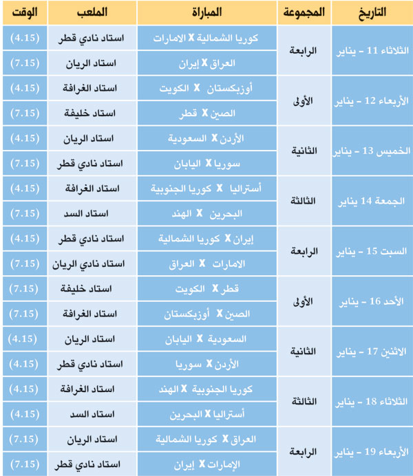 جدول مباريات كأس آسيا لكرة القدم