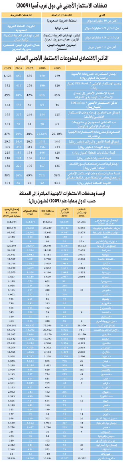 دأبت الهيئة العامة للاستثمار على رصد التطورات المتحققة من مشروعات الاستثمار الأجنبي المباشر التي تعمل بالمملكة، وبصفة خاصة، التطورات المتعلقة بالوظائف، والمشتريات من السوق المحلية، والصادرات. وقد ارتفع رصيد الاستثمارات في المشروعات الأجنبية المباشرة (المملوكة للأجانب) في عام 2009م، وبلغ حوالي (552) مليار ريال، بعد أن كان في حدود (419) مليار ريال في عام 2008م. وقد ارتفعت نسبة أرصدة هذه الاستثمارات، إلى إجمالي رصيد الاستثمارات الأجنبية (100% أجنبية، ومشتركة) من (48%) في نهاية عام 2008م، لتبلغ (49%) بنهاية عام 2009م. ويقدر أن عدد العاملين بمشروعات الاستثمار الأجنبي المباشر يبلغ حوالي (375) ألف فرد، منهم حوالي (101) ألف سعودي، أي أن نسبتهم تبلغ 27% من المجموع. وبلغت مشتريات المشروعات الاستثمار الأجنبي المباشر من السوق المحلية في عام 2009م، حوالي (225) مليار ريال.