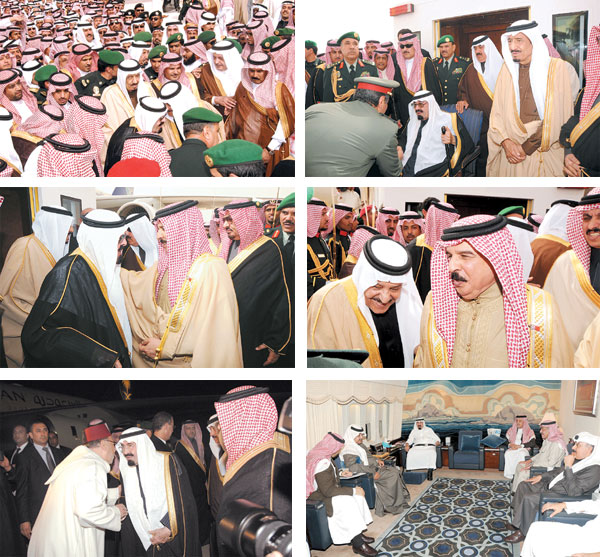 كما كان في استقباله أيده الله صاحب السمو الأمير محمد بن عبدالله بن جلوي وصاحب السمو الملكي الأمير فهد بن محمد بن عبدالعزيز وصاحب السمو الأمير فهد بن مشاري بن جلوي وصاحب السمو الأمير بندر بن محمد بن عبدالرحمن وصاحب السمو الملكي الأمير متعب بن عبدالعزيز وصاحب السمو الأمير عبدالله بن عبدالعزيز بن مساعد أمير منطقة الحدود الشمالية وصاحب السمو الأمير عبدالله بن محمد بن عبدالعزيز وصاحب السمو الملكي الأمير بدر بن عبدالعزيز وصاحب السمو الملكي الأمير نايف بن عبدالعزيز آل سعود النائب الثاني لرئيس مجلس الوزراء وزير الداخلية وصاحب السمو الأمير فيصل بن تركي بن عبدالله وصاحب السمو الأمير فيصل بن تركي بن عبدالعزيز وصاحب السمو الملكي الأمير سلمان بن عبدالعزيز أمير منطقة الرياض وصاحب السمو الملكي الأمير بندر بن خالد بن عبدالعزيز وصاحب السمو الأمير عبدالله بن تركي بن عبدالعزيز وصاحب السمو الملكي الأمير عبدالله بن خالد بن عبدالعزيز وصاحب السمو الملكي الأمير خالد الفيصل بن عبدالعزيز أمير منطقة مكة المكرمة وصاحب السمو الملكي الأمير عبدالإله بن عبدالعزيز مستشار خادم الحرمين الشريفين وصاحب السمو الملكي الأمير أحمد بن عبدالعزيز نائب وزير الداخلية وصاحب السمو الملكي الأمير سطام بن عبدالعزيز نائب أمير منطقة الرياض وصاحب السمو الملكي الأمير مشهور بن عبدالعزيز وأعضاء الوفد الرسمي المرافق لجلالة ملك مملكة البحرين وأصحاب السمو الملكي أمراء المناطق وأصحاب السمو الملكي الأمراء وسماحة مفتي عام المملكة ومعالي رئيس مجلس الشورى وأصحاب الفضيلة العلماء والمشايخ وأصحاب المعالي الوزراء وكبار المسؤولين من مدنيين وعسكريين وجمع غفير من المواطنين.