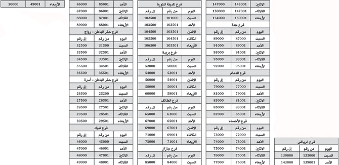 وسيتم استقبال المستندات المطلوبة للصرف خلال هذا الأسبوع لجميع الأرقام في كل من: فرع حائل، مكة المكرمة، الجوف، خميس مشيط، الخرج، الباحة، نجران، القنفذة، بيشة، المجمعة، الدوادمي، القريات، النماص، عرعر وينبع.