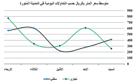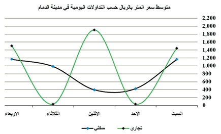 وفي جانب الأسعار فقد بلغت متوسط سعر المتر خلال كامل الأسبوع 459 ريال للمتر في القطاع السكني، و41 ريال للمتر بالنسبة للتجاري، وكما هو واضح بالرسم البياني أن صفقات يومي الأحد والثلاثاء في القطاع التجاري جاءت بحوالي 35 ريال للمتر المربع مما أدى إلى انخفاض متوسط سعر المتر الأسبوعي في القطاع التجاري.
