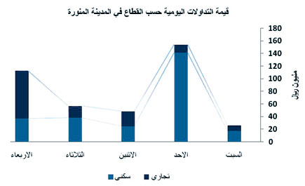 سجلت قيمة التداولات الأسبوعية للقطاع العقاري بالمدينة المنورة 372 مليون ريال مقارنة بـ161 مليون ريال في الأسبوع السابق أي بنسبة ارتفاع 130%، وبلغ نصيب القطاع السكني من قيمة التداولات الأسبوعية بـ 65% ونسبة 35% للقطاع التجاري.
