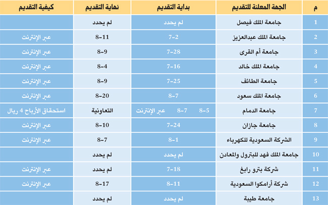 حددت الكثير من الجهات الحكومية والأهلية مواعيد التقديم لطلاب وطالبات الثانوية العامة، التي بدأ بعض منها استقبال المتقدمين فعلياً خلال اليومين الماضيين، فيما ستفتح معظمها أبوابها للطالبين بالالتحاق بها في شهر شعبان. إلى ذلك أعلنت الجامعات السعودية بجميع مناطق ومدن المملكة تواريخ بداية ونهاية مواعيد التقديم, بالإضافة إلى برامج الشركات الحكومية والأهلية التي تستقطب طلاب الثانوية العامة وتقوم بضمهم لبرنامج دراسي ومن ثم توظيفهم كشركة أرامكوا والشركة السعودية للكهرباء.