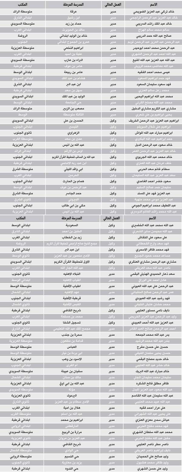 اعتمد مساعد المدير العام للتربية والتعليم بمنطقة الرياض للشؤون التعليمية المكلف الاستاذ فهد بن ناصر العقيل نقل وتكليف 75 مديراً ووكيلاً في حركة النقل للعام الدراسي 1432-1433هـ وذلك بواقع 51 مديراً ووكيلاً تم نقلهم و24 مديراً تم تكليفهم بإدارة المدارس.