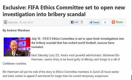 متابعة - فرحان الجارالله : أكَّدت تقارير لوسائل إعلام ومواقع عالمية مهتمة بأخبار الاتحاد الدولي لكرة القدم (الفيفا) أن لجنة الأخلاق التابعة للاتحاد الدولي لكرة القدم (فيفا) ستفتح تحقيقات جديدة في فضيحة الرشوة التي هزت كرة القدم العالمية المتعلقة بالقطري محمد بن همام واتهامه بالتورط في...>>>...
