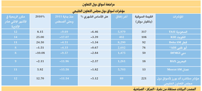 ذكر تقرير شركة المركز المالي الكويتي «المركز» أن الأسواق الخليجية هوت على أثر اضطراب نظيرتها العالمية خلال شهر أغسطس الماضي، وخسر مؤشر ستاندرد آند بورز لدول التعاون (SالجزيرةP GCC 5.12%)، مع تراجع السوق السعودية بنسبة 6.46%. كذلك تبعهم المؤشر الوزني للسوق الكويتية الذي خسر 3.4%. وأضاف تقرير المركز أن مؤشرات الأسواق الخليجية انخفضت، وكان أقلها خسارة سوق أبوظبي للأوراق المالية الذي هبط بنسبة 0.67%، وعليه كان الأفضل أداءً في مؤشر دول التعاون منذ بداية العام وحتى الآن.