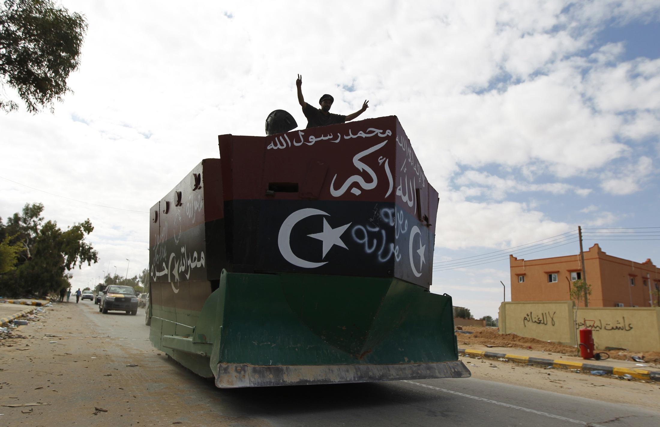 وقد دفع مقاتلو المجلس الوطني الانتقالي أمس الأربعاء بأغرب سلاح لهم على الإطلاق حتى الآن، وهو عبارة عن عملاق غريب الهيئة من الخرسانة والصلب، يبدو مزيجاً من جرافة وسفينة حربية. وهذا الوحش الضخم له مقدمة مدببة كسفينة حربية، وعلى جانبيه فتحات عليها أغطية من الصلب يمكن تحريكها. ويتشح الوحش برداء من الخرسانة بين ألواح من الصلب مطلي بألوان العلم الليبي الجديد، وهي الأحمر والأخضر والأسود. ومكتوب على المقدمة المدببة عبارة (لا إله إلا الله محمد رسول الله). واستخدمت أساساً لهذا السلاح الغريب جرافة ذات جنازير، وصنع في ورش تابعة للمعارضين في مدينة مصراتة قبل سقوط طرابلس، وهو مصمم لاقتحام حواجز الطرق والمتاريس. وكان من المفترض أن يُستخدم أول مرة في معركة طرابلس، لكن بعد أن سقطت العاصمة سريعاً في أيدي مقاتلي المعارضة ظل خارج الخدمة إلى أن ظهر أمس في ساحة معركة سرت. والمركبة مسلحة بخمسة مدافع رشاشة ثقيلة يعمل على تشغيلها أربعة أفراد، فضلاً عن مدفع دبابة في أعلاها، وفي الداخل توجد بنادق كلاشينكوف عدة وقاذفات صاروخية بجوار زجاجات مياه وموز. وهناك أيضاً خوذة مملوءة بالقنابل اليدوية للاستخدام عند الضرورة.