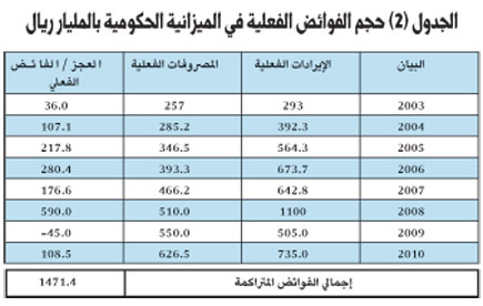 لقد أحرزت المملكة نسبة فائض في الميزانية الحكومية إلى الناتج المحلي الإجمالي تطورا إيجابيا ملموسا، حيث تطورت هذه النسبة من 13.5% في عام 1975 إلى ما يوازي 33.6% في عام 2008، وقد تمكنت من الخروج من نطاق السلبية خلال الفترة (1983-2002) لكي تسجل مؤشرا إيجابيا منذ بداية عام 2003 وحتى الآن، بما يدلل على حجم الإصلاحات الاقتصادية التي مكنت الميزانية من إحراز فائض خلال السنوات الخمس الأخيرة.