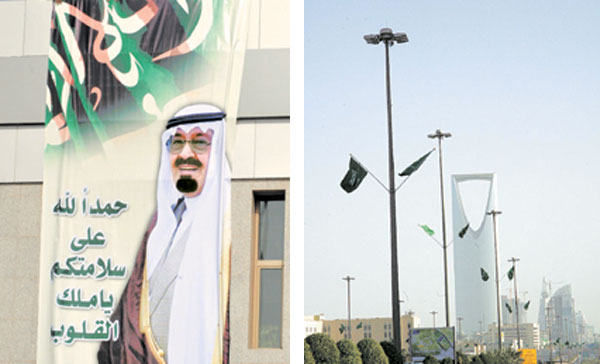 ارتسمت الفرحة وعمت السعادة وأصبح الجميع في لهف وشوق لإطلالة وعودة خادم الحرمين الشريفين الملك عبدالله بن عبدالعيز آل سعود وعمت المملكة مظاهر الفرح ابتهاجاً بهذا المقدم الميمون في كافة أرجائها ولبست العاصمة الرياض أحلى وأجمل حللها ورفرفت أعلام المملكة الخفاقة في شوارعها وميادينها وبجانبها صور خادم الحرمين الشريفين وسمو ولي عهده الأمين وسمو النائب الثاني لتعيش بلادنا الغالية أياماً سعيدة وفرحة غامرة بعودة ملك الإنسانية من رحلته العلاجية الموفقة.