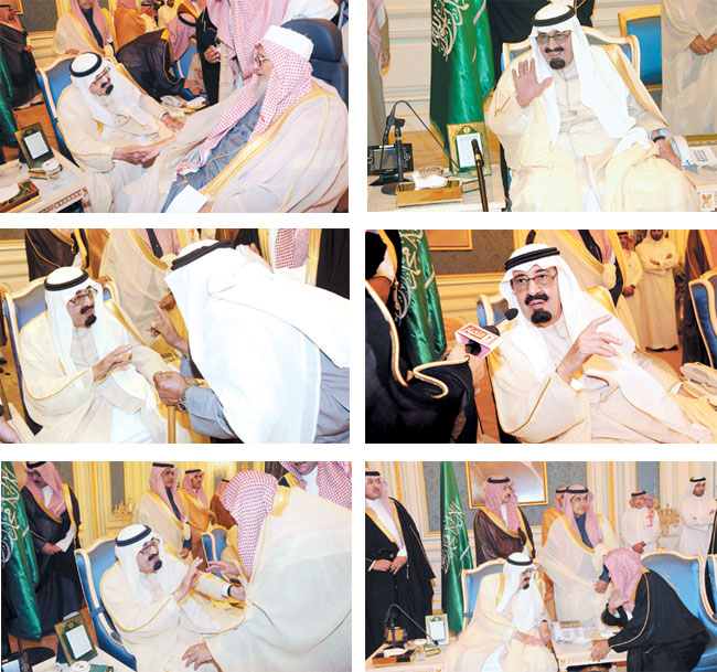 استقبل خادم الحرمين الشريفين الملك عبدالله بن عبدالعزيز آل سعود - حفظه الله - في الديوان الملكي بقصر اليمامة بعد ظهر أمس أصحاب السمو الملكي الأمراء وسماحة مفتي عام المملكة الشيخ عبدالعزيز بن عبدالله آل الشيخ وأصحاب الفضيلة العلماء والمشايخ وأصحاب المعالي الوزراء وكبار المسؤولين وجموعاً من المواطنين الذين قدموا للسلام عليه - أيده الله - وتهنئته بسلامة الوصول إلى أرض الوطن سالماً معافى بحمد الله.