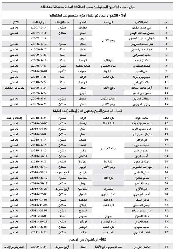 والجزيرة تقدم قائمة الموقوفين خلال فترة منذ إقرار الكشف على المنشطات.