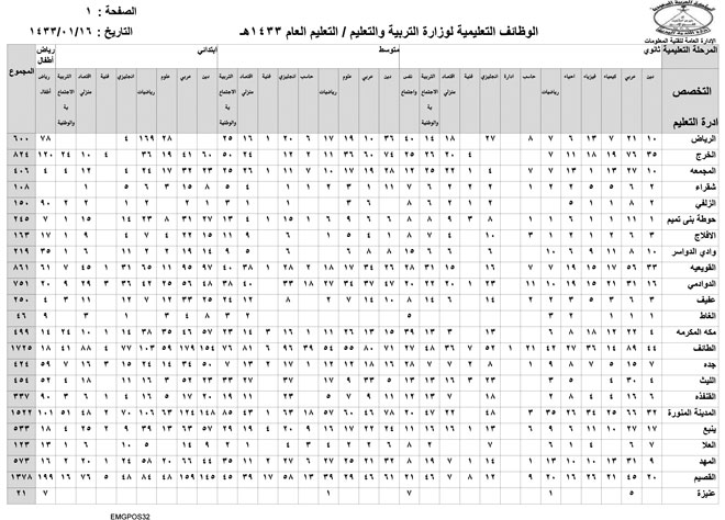 أعلنت وزارة الخدمة المدنية تفاصيل الوظائف المشمولة بلائحة الوظائف التعليمية التي وردت من وزارة التربية والتعليم موضحاً بها المادة والمرحلة والمقر والعدد المحدثة بالأمر الملكي الكريم رقم (121-أ) وتاريخ 2-7-1432هـ وتفاصيل تلك الوظائف حسب ما حددته وزارة التربية والتعليم على النحو التالي: