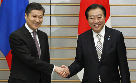 رئيس الوزراء الياباني يوشيهيكو تودا (يمين) يصافح نظيره رئيس الوزراء المنغولي سوكباتارين باتبولد (يسار) في الذكرى الأربعين للعلاقات الثنائية بيين البلدين . رويترز * * * الملك الماليزي عبد الحليم شاه يستلم الوشاح الملكي من رئيس الوزراء نجيب عبد الرزاق أثناء افتتاح