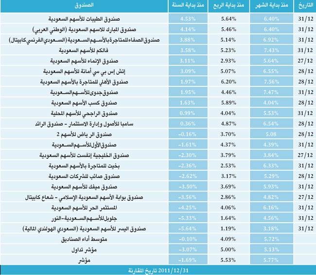حققت صناديق الاستثمار في الأسهم السعودية المتوافقة مع الضوابط الشرعية و المدارة من شركات الأستثمار المرخصة من هيئة السوق المالية أداء أفضل من السوق خلال عام 2011م حيث كان متوسط أداء هذه الصناديق أفضل من أداء السوق بما يقارب 1.5% حسب الجدول المرفق.وحول هذا الموضوع علق وليد بن غيث مدير عام إدارة الأصول في شركة الجزيرة كابيتال بأن هذه النتائج تعكس الجهود القيمة التي يقدمها مدراء الصناديق حيث أصبحت الشركات المرخصة تبذل جهودا واستثمارات أكبر في كوادرها من أجل التمكن من تحقيق نتائج تلبي تطلعات عملائها مع إدارة مهنية للمخاطر.