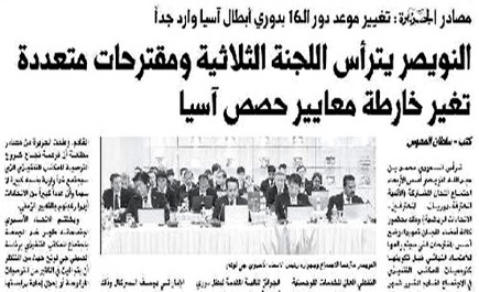 كتب - سلطان المهوس : أسقط أعضاء المكتب التنفيذي بالاتحاد الآسيوي لكرة القدم يوم أمس اقتراحًا يتضمن تغيير موعد بطولة كأس آسيا للمنتخبات لتكون قبل انطلاقة مونديال كأس العالم كل أربع سنوات وخلالها يتم اعتبار أصحاب المراكز الأربعة الأولى بالبطولة متأهلين رسميًا لكأس العالم بينما يتم إيجاد