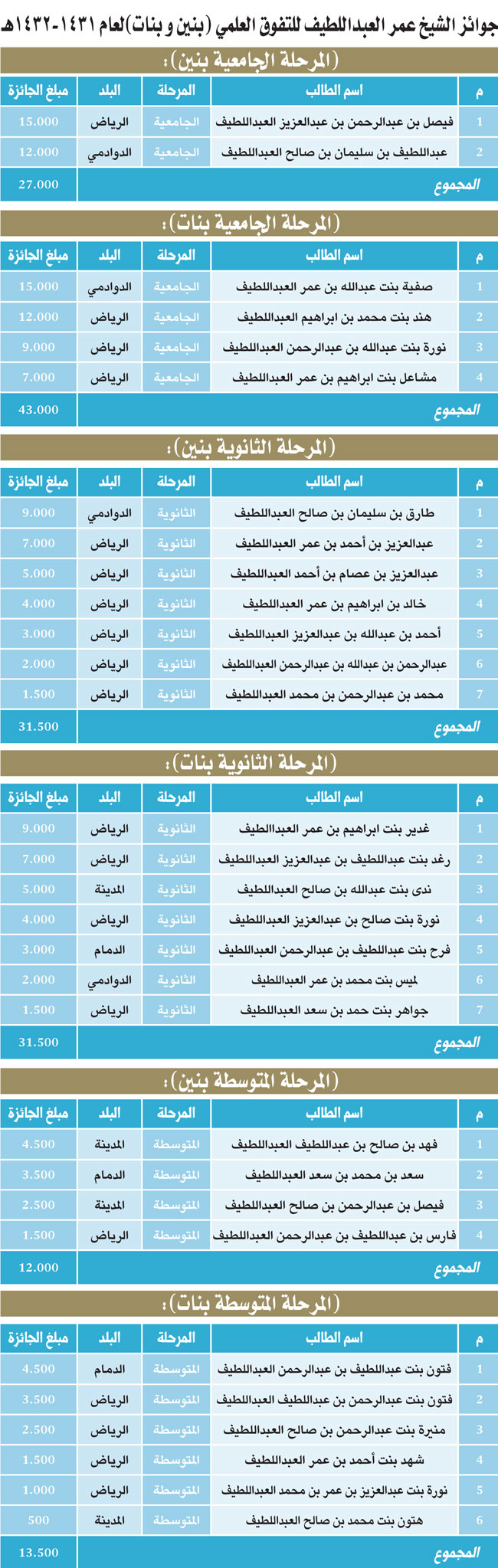 أقامت أسرة العبداللطيف الأسبوع الماضي حفلاً لتكريم الفائزين بجائزة العبداللطيف للتفوق العلمي 1431-1432هـ أقيم في قاعة بريدة بفندق الانتركونتنينتال الرياض، بحضور عدد كبير من الأهالي، وذلك لجميع المراحل الدراسية والدراسات العليا، في مراحل (الجامعية والثانوي والمتوسط) حيث تضمنت الجوائز للمتفوقين مبالغ مالية تشجيعية.