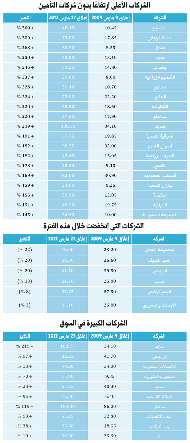 وبالعودة أكثر إلى الخلف في السلم الزمني للمؤشر نجد أن مؤشر السوق سجل خلال جلسة 9 مارس 2009 أدنى إغلاق له خلال الفترة الممتدة من 2003م إلى 2012 (خلال أكثر من 9 سنوات) وحاولت أرقام رصد إغلاقات الشركات والمؤشر بين إغلاق هذه وجلسة 27 مارس 2012، وبينت المعطيات أن مؤشر السوق ارتفع بنسبة أكثر من 88 % من 4130 نقطة إلى 7767 نقطة، وسجلت أغلب الشركات ارتفاعات متفاوتة تجاوزت عند كثير منها نسبة الـ100 % في حين لم يسجل إلا 6 شركات انخفاضًا.