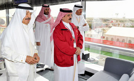 البحرين - جمال الياقوت : شهد حضرة صاحب الجلالة الملك حمد بن عيسى آل خليفة ملك مملكة البحرين ـ حفظه الله ـ بحضور صاحب السمو الملكي الأمير خليفة بن سلمان آل خليفة رئيس الوزراء بمملكة البحرين منافسات جائزة البحرين الكبرى لطيران الخليج لسباق السيارات الفورمولا واحد التي انطلقت على حلبة البحرين