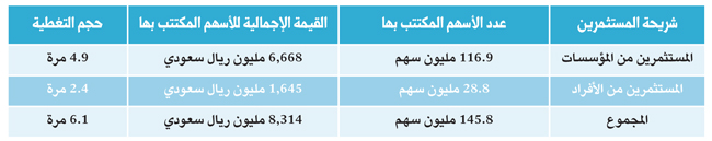 أعلنت «سامبا كابيتال» - المستشار المالي ومدير الاكتتاب ومدير سجل اكتتاب المؤسسات ومتعهد تغطية الاكتتاب الرئيسي لمجموعة الطيار للسفر - أن اكتتاب «مجموعة الطيار للسفر» والذي أُغلق يوم الأحد الماضي ودام 7 أيام، أودع فيه نحو 1.024 مليون مواطن سعودي أكثر من 1645 مليون ريال في أسهم الشركة، ليبلغ حجم التغطية 241% من القيمة المطلوبة لتغطية الأسهم المطروحة للشريحة المخصصة للمكتتبين الأفراد. وعليه، فقد بلغت الحصيلة الكلية للاكتتاب 8314 مليون ريال سعودي بنسبة تغطية 608%. وسيتم تخصيص الحد الأدنى وهو 10 أسهم لكل مكتتب من الأفراد ومن ثم تخصيص ما تبقى من الأسهم على المكتتبين على أساس تناسبي بناء على نسبة ما طلبه كل مكتتب إلى إجمالي الأسهم المطلوب الاكتتاب فيها بمعدل 9.44 بالمائة. فيما أكدت «سامبا كابيتال» على أن البنوك السعودية ستتولى اليوم الأحد 27/5/2012/2012م رد الفائض من الاكتتاب للمساهمين. وسيتم الإعلان عن إدراج السهم لاحقاً بعد موافقة هيئة السوق المالية.