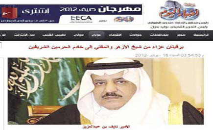الجزيرة - واس: رفع صاحب السمو الملكي الأمير أحمد بن عبد العزيز وزير الداخلية أصالة عن نفسه ونيابة عن منسوبي وزارة الداخلية أخلص التعازي وصادق المواساة لخادم الحرمين الشريفين الملك عبد الله بن عبد العزيز آل سعود -حفظه الله- في وفاة فقيد الأمة والوطن صاحب السمو الملكي الأمير نايف بن عبد