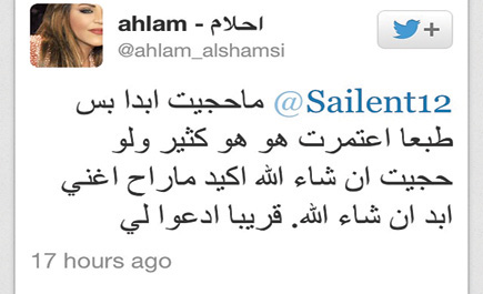 قالت الفنانة الإماراتية أحلام إنها أدت فريضة العمرة لكنها لم تؤد فريضة الحج، وهي إن فعلت ذلك فستترك الغناء للأبد، وأضافت: سيكون ذلك قريبا جدا. وتعديلا لتصريحاتها التي أثارت الشارع قبل شهر حاولت أحلام امتصاص غضب الجماهير، بأن قالت إنها تنوي ترك موقع التواصل الاجتماعي (تويتر) خلال شهر رمضان