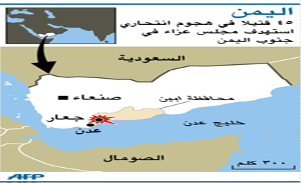صنعاء - الجزيرة - عبدالمنعم الجابري: هز تفجير انتحاري عنيف مجلس عزاء في مدينة جعار بمحافظة أبين في جنوب اليمن مساء السبت, مما أدى الى مقتل 45 شخصاً وإصابة 40 آخرين. وأكد مصدر محلي بمحافظة أبين جنوبي اليمن أمس الأحد أن 45 شخصاً لقوا حتفهم وجرح 40 آخرون جراء التفجير الانتحاري