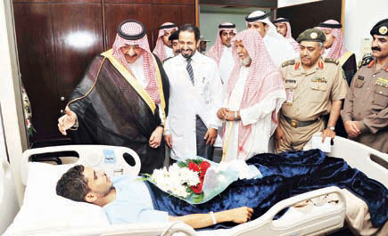 الظهران - واس: قام صاحب السمو الملكي الأمير محمد بن نايف بن عبدالعزيز مساعد وزير الداخلية للشؤون الأمنية مساء أمس الأول الأحد بزيارة للجندي أول سعد بن متعب بن محمد الشمري الذي يتلقى العلاج في مجمع الملك فهد الطبي بالظهران من الإصابة التي نتجت عن تعرضه لإطلاق نار من قبل أربعة من مثيري الشغب