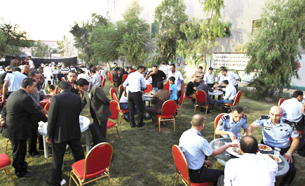 - ضبّاط شرطة أردنيون وجنود من حرس السجون يتناولون وجبة إفطار جماعي مع السجناءِ وعوائلِهم، حيث قامت إدارةُ السجِون بمبادرة، تَسْمحُ للسجناءِ أَنْ يتناولوا الطعام مَع عوائلِهم، وكذلك تقدم لهم هدايا وجوائزِ محفّزةِ لاشتراكِهم في نشاطاتِ السجنِ، خلال شهرِ رمضان...رويترز ***